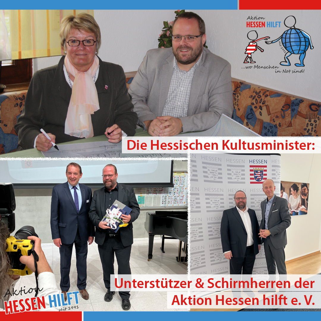 Unser heutiger Kultusminister, Armin Schwarz, hat mich ebenfalls im Kultusministerium empfangen (Foto unten rechts) und Anfang 2025 die Schirmherrschaft über die „Hessische Schulaktion für Menschen in Not“ übernommen. Seitdem unterstützt uns das Ministerium in vielfältiger Weise bei unserer Arbeit.
