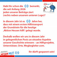 Habt Ihr schon die (35) bemerkt, die seit Anfang 2026 jeden unserer Beiträge ziert (rechts neben unserem unteren Logo)? In diesem Jahr ist es 35 Jahre her, dass mit einem ersten Hilfstransport der Grundstein für die heutige ‚Aktion Hessen hilft‘ gelegt wurde. Deshalb wollen wir uns in diesem Jahr in gelegentlichen Posts an einzelne Aspekte unserer Geschichte erinnern – an Hilfsprojekte, Unterstützer, Orte, Wegbegleiter uvm. Ihr dürft gespannt sein!